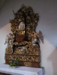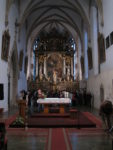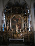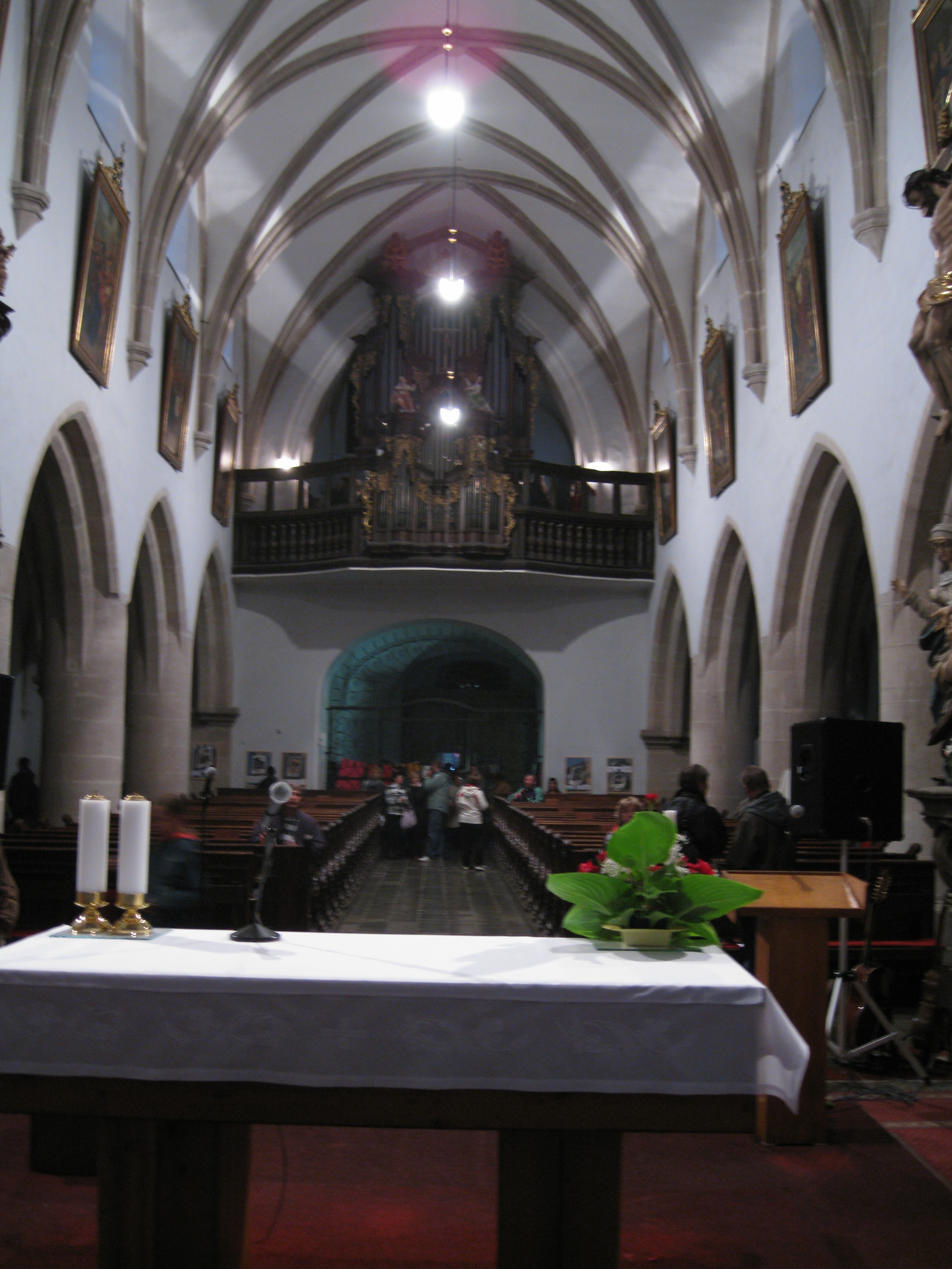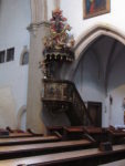 Ve střední lodi je na epištolní straně rokoková kazatelna od Lazara Widmana z roku 1740. Na stříšce kazatelny se nachází sv. František v ohnivém voze, pod stříškou dřevoryt sv. Františka a sv. Antonína Paduánského, držící v ruce Nejsvětější svátost a postavy sv. Bonaventury a sv. Jana Kapistrána. Vnější strana kazatelny je ozdobena třemi obrazy ze života sv. Františka a to sycení napravených hladových loupežníků sv. Františkem, kteří poté vstupují do řádu, prostřední zkrocení zuřivého vlka ohrožujícího obyvatele městečka Gubbio sv. Františkem, a na posledním pokorného a přírodu obdivujícího sv. Františka.