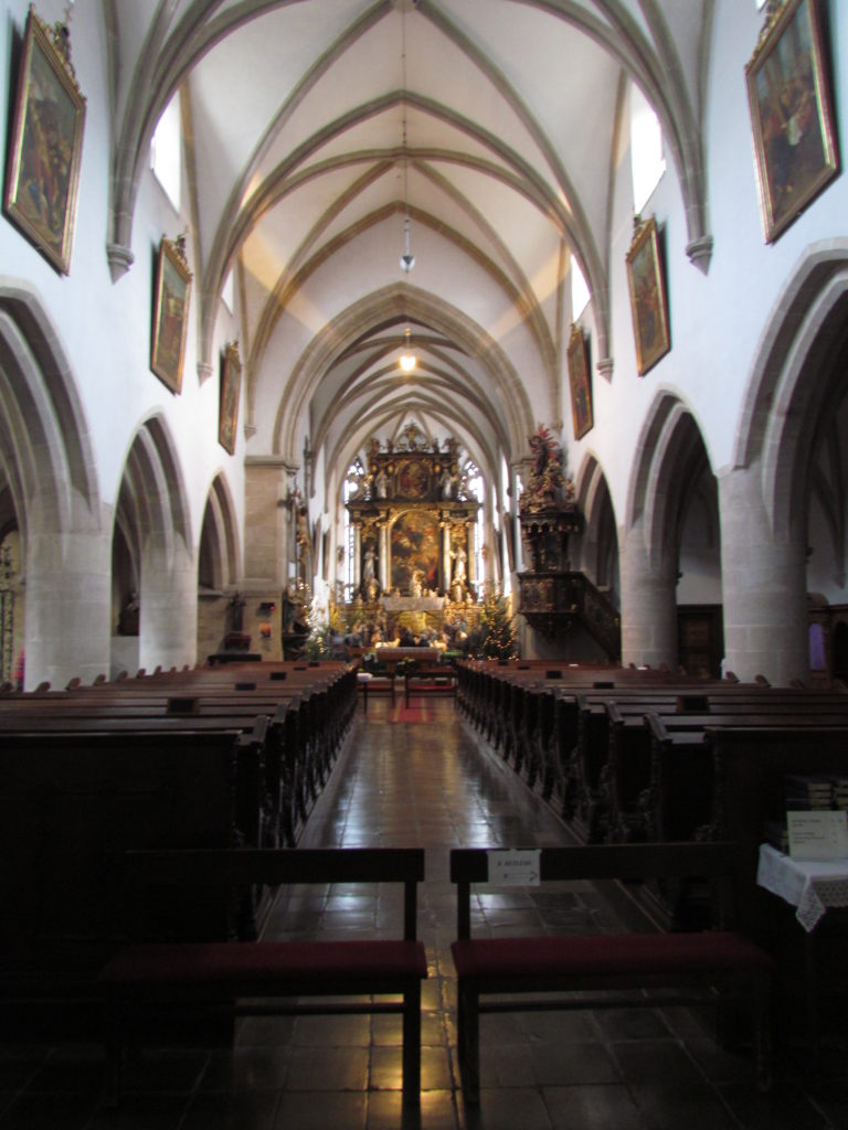 Podlaha trojlodí byla původně umístěna asi o metr níže oproti presbyteriu, později však byla zvýšena. K severní lodi byla na východním konci přistavěna osmiboká kaple sv. Antonína Paduánského, na západním konci dnes již zrušená kaple sv. Anny. V čele severní lodi se na oltáři nachází barokní sousoší Piety z druhé poloviny 17. století.