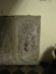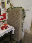 Velikost písma je 2 cm, slova nejsou oddělována mezerami. Pod textem je po obvodu reliéf s ratolestmi a tvářemi andělíčků o výšce 5,6 cm. Pod tímto reliéfem je na severní straně reliéf Panny Marie s Ježíškem a na jižní straně reliéf Kalvárie.