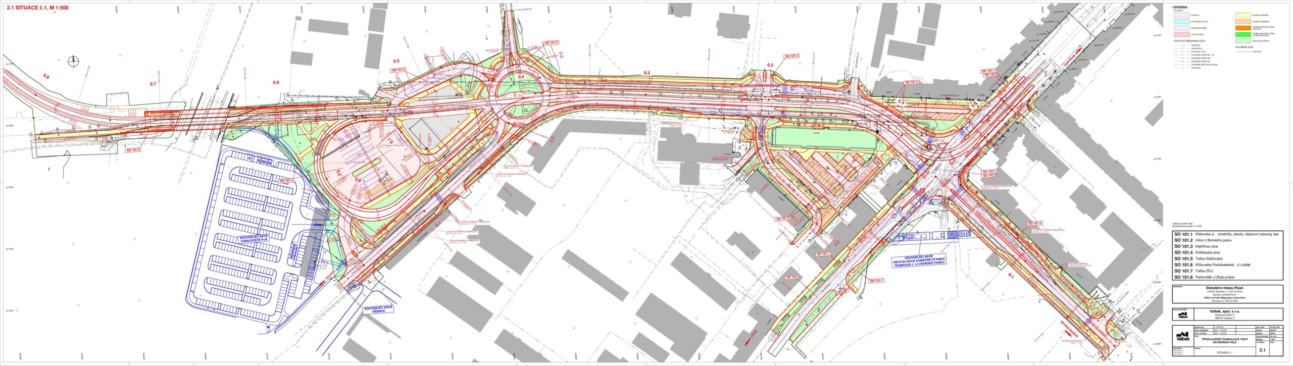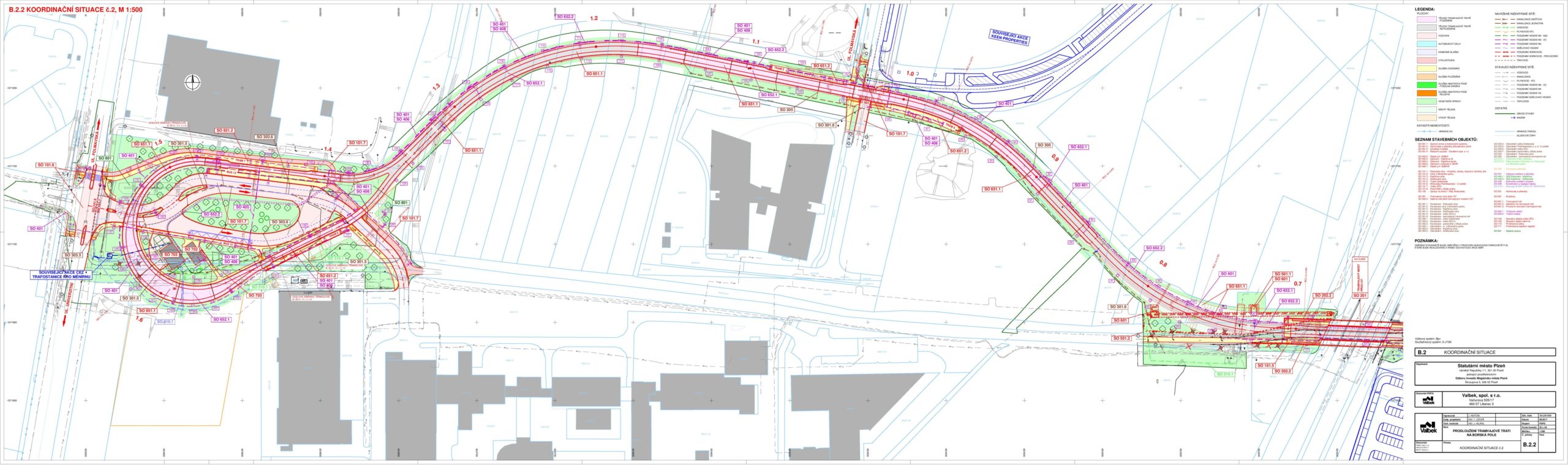 Po celé délce nové komunikace v Kaplířově ulici jsou v projektu oboustranně navrženy cyklopruhy či cyklostezky. Pokud si stáhnete do svého počítače výše uvedené situace stavby (obrázky), tak je uvidíte – jsou značeny tmavě růžovou barvou. Jsou i na mostním objektu přes dálniční přivaděč (silnici I/27)